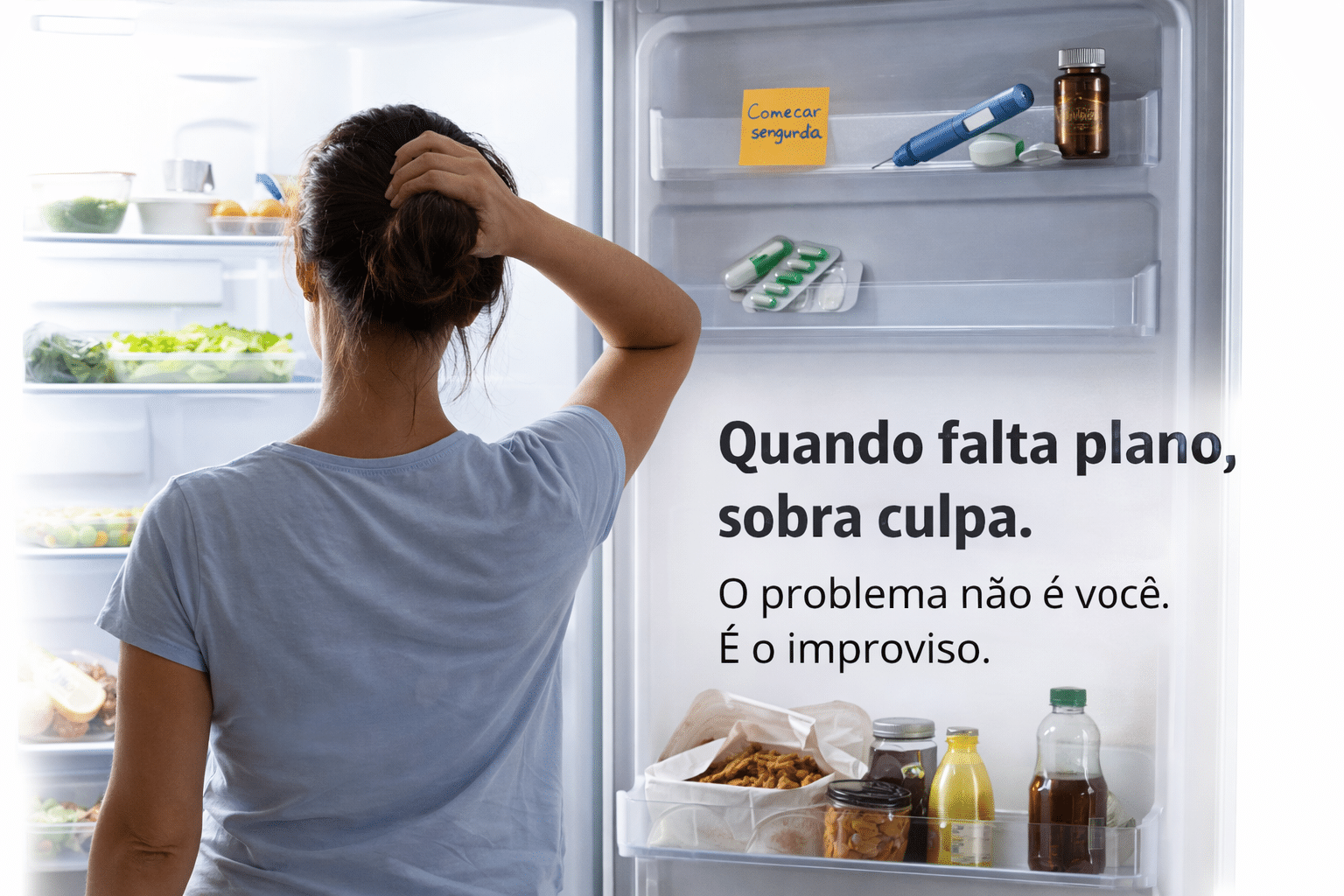 O problema é viver sem uma base alimentar consistente que desinflame seu corpo, organize sua semana e devolva previsibilidade para o emagrecimento acontecer. Sem base, você recomeça. Com base, o corpo começa a cooperar.