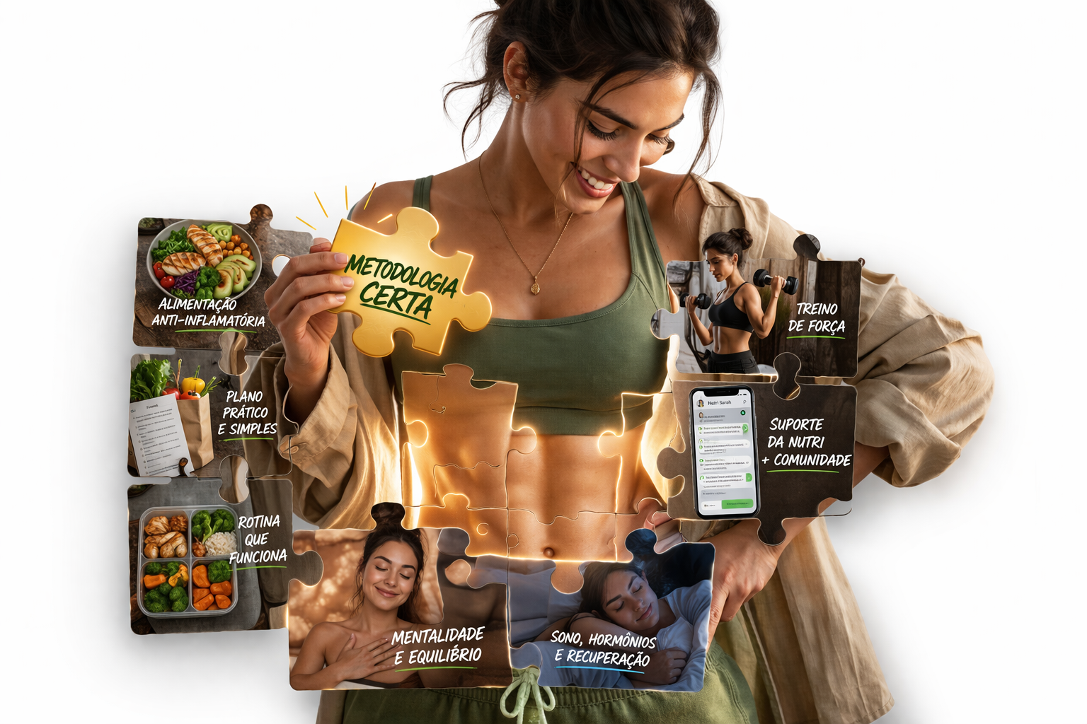 Primeiro você organiza sua alimentação de forma prática. Depois o resto começa a funcionar junto: treino, energia, intestino, sono, shape e consistência.
